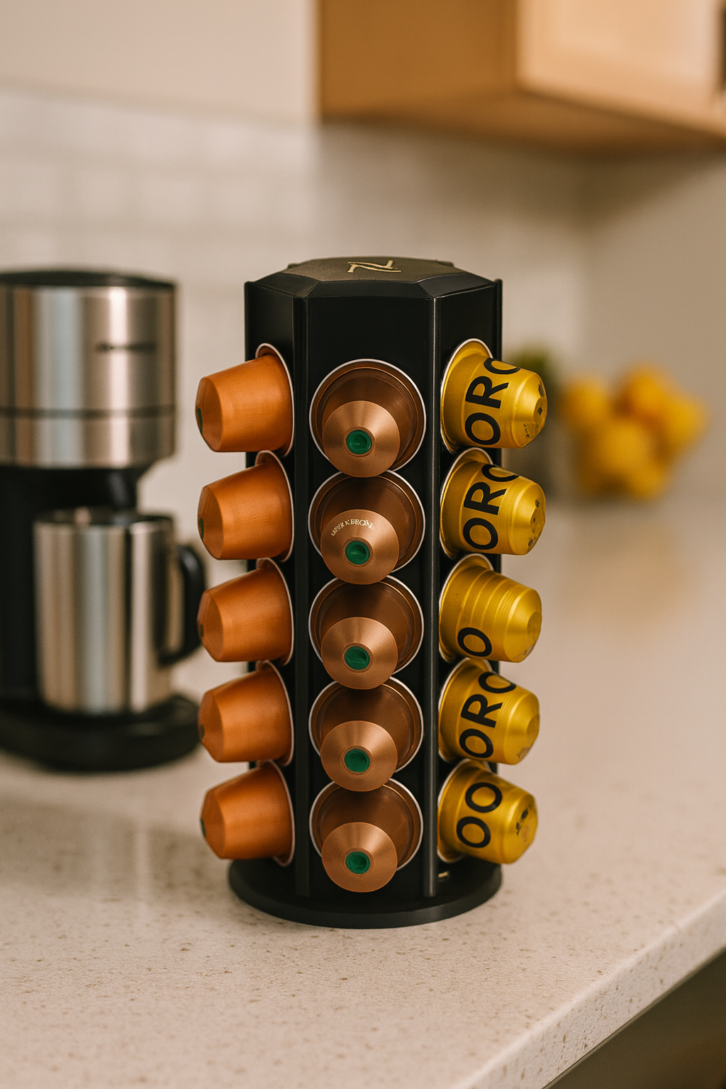 A sleek, rotating capsule organizer designed for Nespresso Original pods.
